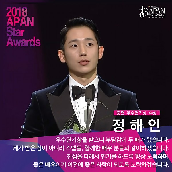 '2018 APAN Star Awards' 중편드라마 남자 우수연기상 정해인 페이지 정보 작성자 연매협 작성일18-10-26 14:07 조회13,827회 본문 ▲ 중편드라마 남자 우수연기상 정해인(JTBC '밥 잘 사주는 예쁜 누나') 이전글 다음글 목록