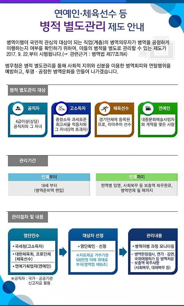 연예인, 체육선수등 병적 별도관리 제도 안내