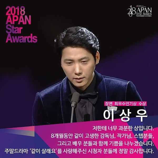 '2018 APAN Star Awards' 장편드라마 남자 최우수연기상 이상우 페이지 정보 작성자 연매협 작성일18-10-26 14:08 조회14,600회 본문 ▲ 장편드라마 남자 최우수연기상 이상우(KBS2 '같이 살래요') 이전글 다음글 목록