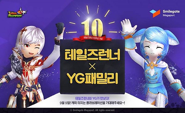 스마일게이트 메가포트는 올해로 10주년을 맞은 '테일즈런너' 홈페이지에 YG 엔터테인먼트 소속 연예인들과의 협업 예고 이미지를 공개했다. 양사는 오는 9월 9일부터 공동 기획한 여러 콘텐츠를 게이머들에게 차례대로 선보일 예정이다. 또한, 이 소식을 소셜네트워크서비스에 공유하는 게이머들은 '타임 코인' 아이템을 받을 수 있다.