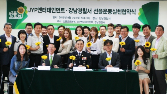 선플운동본부(이사장 민병철 건국대 교수)는 9월 7일(월), 강남경찰서 6층 중회의실에서 JYP엔터테인먼트(대표 정욱), 강남경찰서(서장 김학관)와 선플운동실천협약을 체결하고 ‘청소년 인성교육과 건전한 사이버 언어문화 개선을 위한 공동사업’을 추진하기로 합의했다.