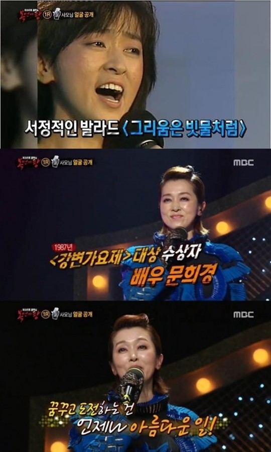 문희경은 28일 방송된 MBC ‘일밤-복면가왕’에 출연, 사모님은 쇼핑중이란 닉네임으로 연기파 배우라는 타이틀이 무색할 만큼 카리스마 있는 보컬과 뛰어난 가창력을 선보이며 판정단에게 충격을 안겨주었다.