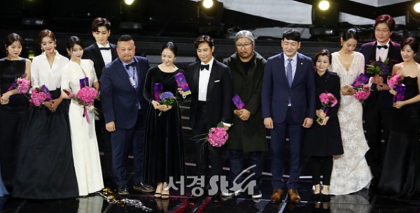 13일 서울 경희대 평화의전당에서 열린 ‘아시아태평양 스타 어워즈(2018 APAN)’에 참석한 수상자들과 관계자들이 포즈를 취하고 있다.